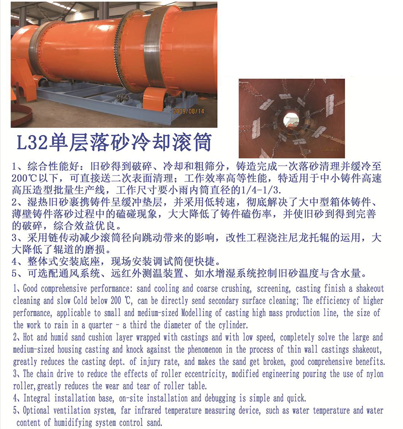 1.综合性能好:旧砂得到破碎、冷却和粗筛分,铸件完成一次落砂清理并缓冷至200°C以下,可直接送二次表面清理完成多工序工作;密封除尘好,工作噪声低,环保条件优越;工作效率高等性能。特适于中小铸件高速高压造型批量生产线。