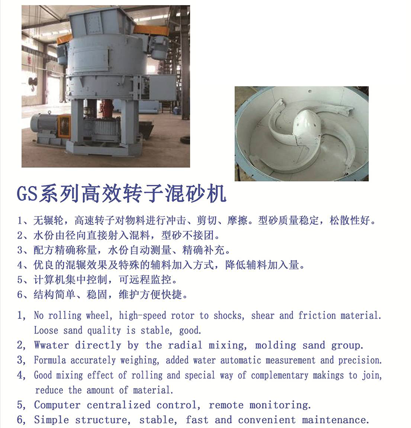 1. 无碾轮,高速转子对物料进行冲击、剪切、摩擦,型砂质量稳定,松散性好。